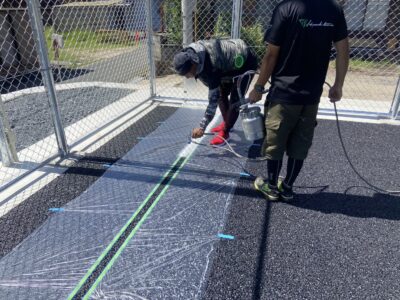 アスファルト面なので、塗料のにじみが懸念されましたので、吹付施工としました